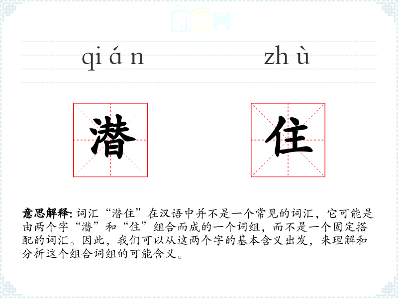 词汇“潜住”在汉语中并不是一个常见的词汇,它可能是由两个字“潜”和“住”组合而成的一个词组,而不是一个固定搭配的词汇。因此,我们可以从这两个字的基本含义出发,来理解和分析这个组合词组的可能含义。