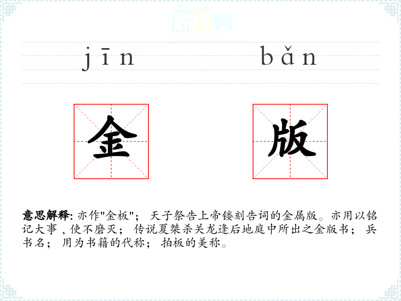 亦作"金板"; 天子祭告上帝镂刻告词的金属版。亦用以铭记大事﹐使不磨灭; 传说夏桀杀关龙逢后地庭中所出之金版书; 兵书名; 用为书籍的代称; 拍板的美称。