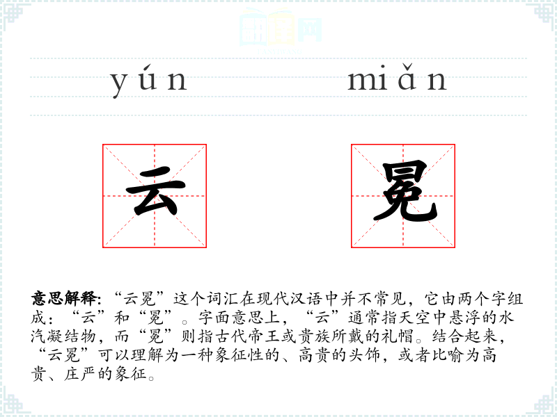在文学作品中,“云冕”可能被用来形容某种高贵、神圣或超凡脱俗的形象,如神话中的神祇或英雄。在口语中,这个词汇可能不太常用,除非是在特定的文学或历史讨论中。在专业领域,如历史学或文学研究中,可能会用来描述古代服饰或象征意义。