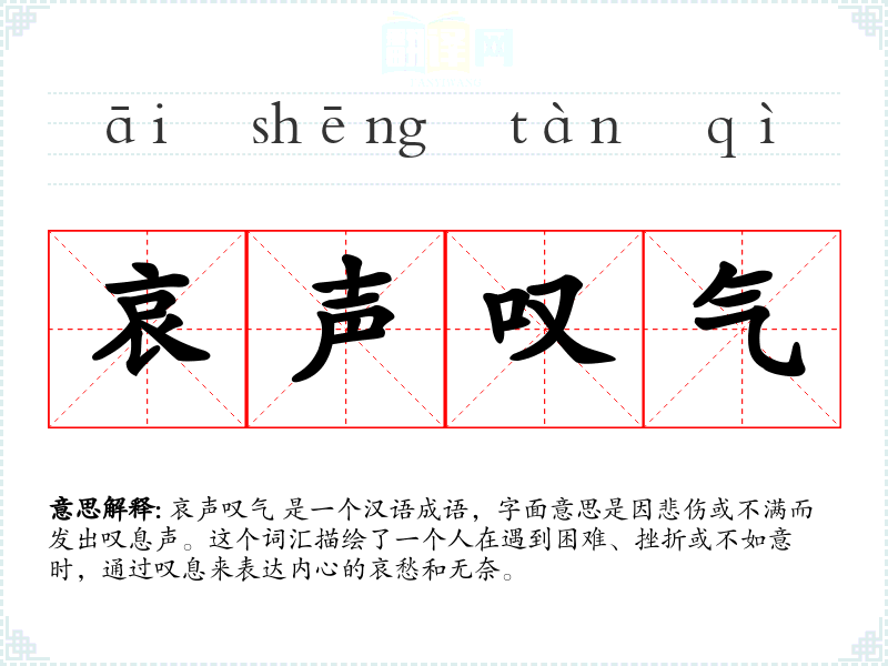 哀声叹气 是一个汉语成语,字面意思是因悲伤或不满而发出叹息声。这个词汇描绘了一个人在遇到困难、挫折或不如意时,通过叹息来表达内心的哀愁和无奈。