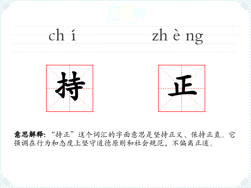 “持正”这个词汇的字面意思是坚持正义、保持正直。它强调在行为和态度上坚守道德原则和社会规范,不偏离正道。