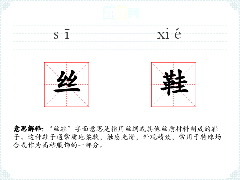 “丝鞋”字面意思是指用丝绸或其他丝质材料制成的鞋子。这种鞋子通常质地柔软,触感光滑,外观精致,常用于特殊场合或作为高档服饰的一部分。