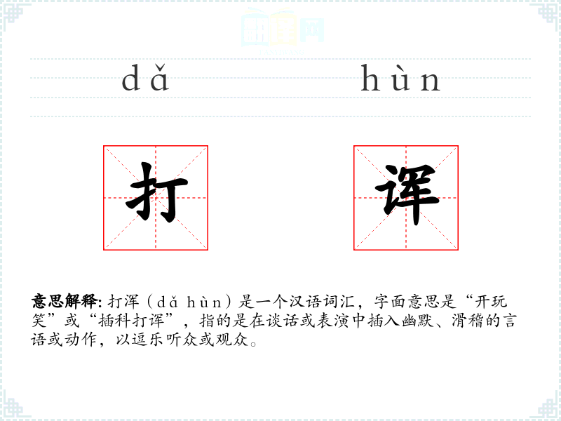 打浑(dǎ hùn)是一个汉语词汇,字面意思是“开玩笑”或“插科打诨”,指的是在谈话或表演中插入幽默、滑稽的言语或动作,以逗乐听众或观众。