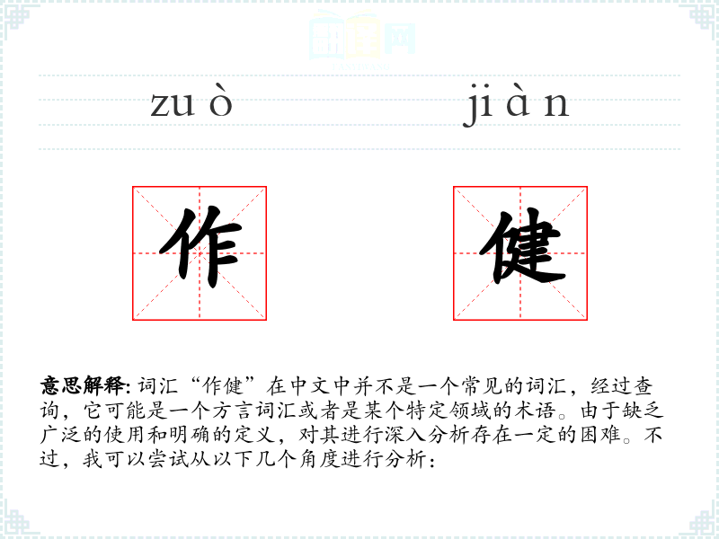 由于“作健”不是一个标准汉语词汇,对其进行深入分析存在一定的困难。在语言学习和表达中,了解和使用标准汉语词汇更为重要,以确保沟通的准确性和效率。