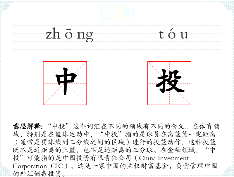 - 同义词:在篮球中,“中距离投篮”可以视为“中投”的同义词。在金融领域,“主权财富基金”可以与“中投”互换使用。