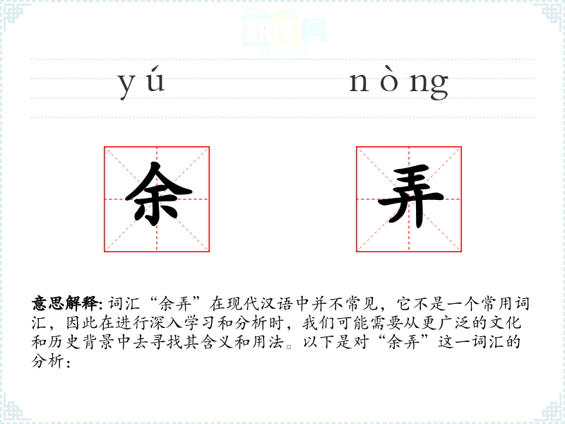词汇“余弄”在现代汉语中并不常见,它不是一个常用词汇,因此在进行深入学*和分析时,我们可能需要从更广泛的文化和历史背景中去寻找其含义和用法。以下是对“余弄”这一词汇的分析: