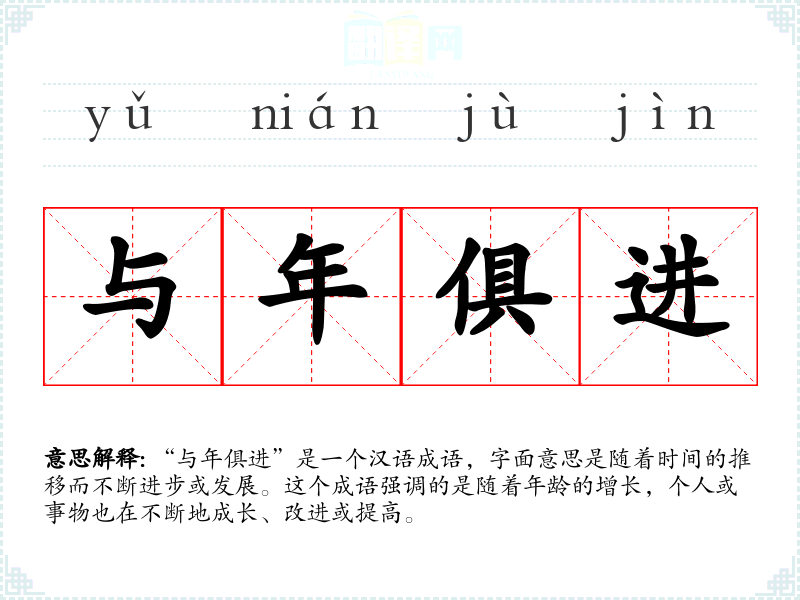 “与年俱进”是一个汉语成语,字面意思是随着时间的推移而不断进步或发展。这个成语强调的是随着年龄的增长,个人或事物也在不断地成长、改进或提高。