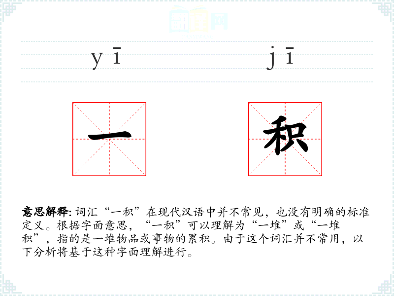 词汇“一积”在现代汉语中并不常见,也没有明确的标准定义。根据字面意思,“一积”可以理解为“一堆”或“一堆积”,指的是一堆物品或事物的累积。由于这个词汇并不常用,以下分析将基于这种字面理解进行。