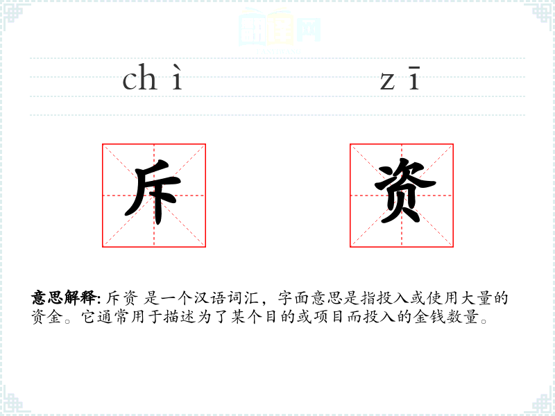 斥资 是一个汉语词汇,字面意思是指投入或使用大量的资金。它通常用于描述为了某个目的或项目而投入的金钱数量。