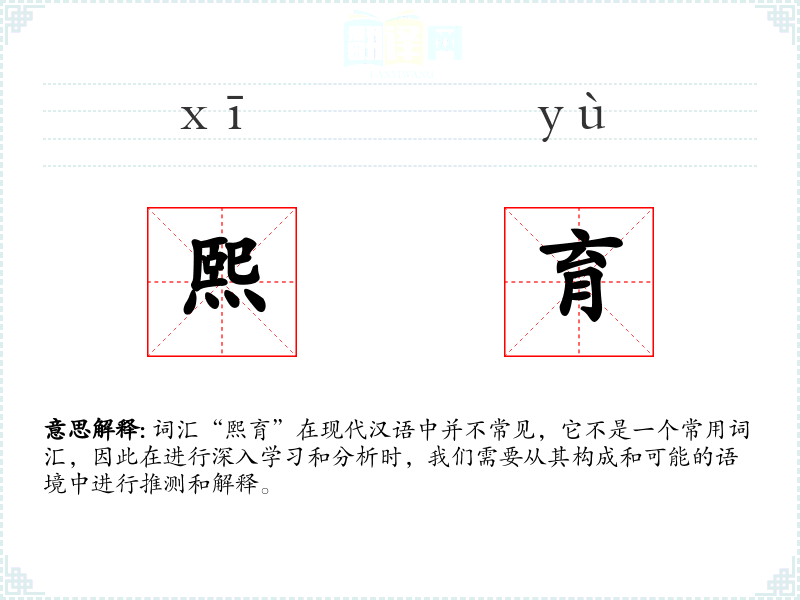 词汇“熙育”在现代汉语中并不常见,它不是一个常用词汇,因此在进行深入学习和分析时,我们需要从其构成和可能的语境中进行推测和解释。