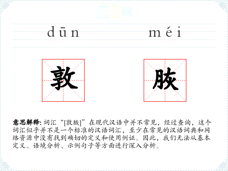 词汇“[敦脄]”在现代汉语中并不常见,经过查询,这个词汇似乎并不是一个标准的汉语词汇,至少在常见的汉语词典和网络资源中没有找到确切的定义和使用例证。因此,我们无法从基本定义、语境分析、示例句子等方面进行深入分析。