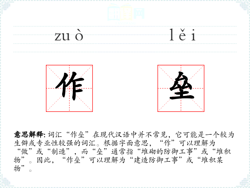 - 理解:作垒是一个具有特定军事和建筑意义的词汇,虽然在日常语言中不常见,但在相关领域中具有重要意义。