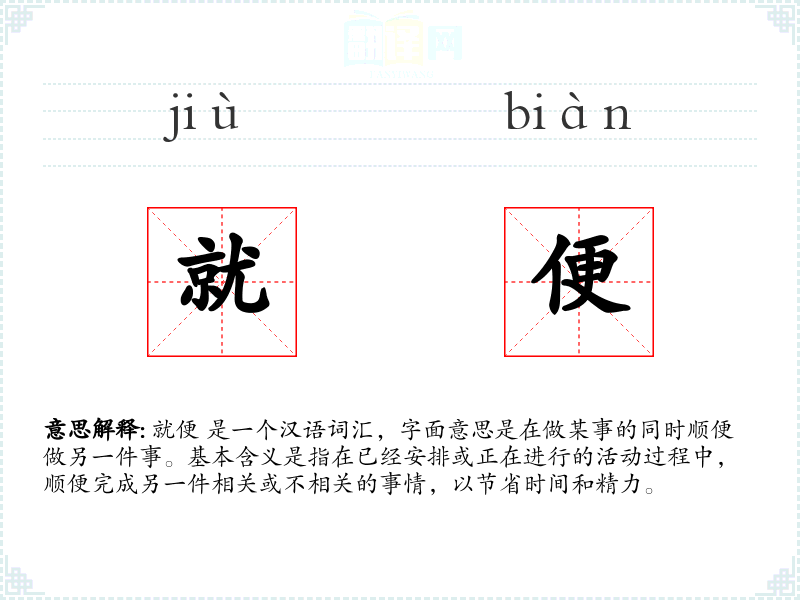 就便 是一个汉语词汇,字面意思是在做某事的同时顺便做另一件事。基本含义是指在已经安排或正在进行的活动过程中,顺便完成另一件相关或不相关的事情,以节省时间和精力。