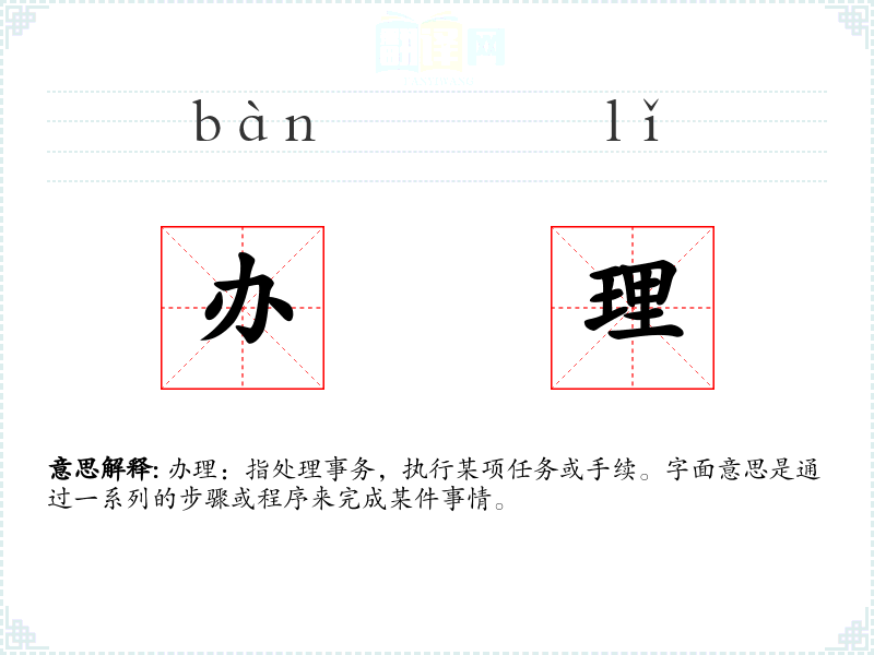 办理:指处理事务,执行某项任务或手续。字面意思是通过一系列的步骤或程序来完成某件事情。