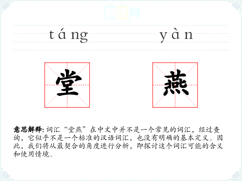 词汇“堂燕”在中文中并不是一个常见的词汇,经过查询,它似乎不是一个标准的汉语词汇,也没有明确的基本定义。因此,我们将从最契合的角度进行分析,即探讨这个词汇可能的含义和使用情境。