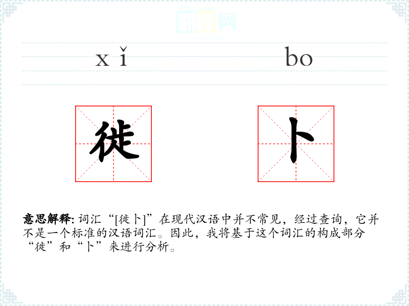 词汇“[徙卜]”在现代汉语中并不常见,经过查询,它并不是一个标准的汉语词汇。因此,我将基于这个词汇的构成部分“徙”和“卜”来进行分析。