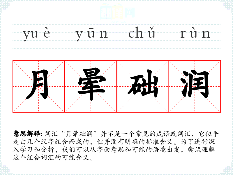 词汇“月晕础润”并不是一个常见的成语或词汇,它似乎是由几个汉字组合而成的,但并没有明确的标准含义。为了进行深入学*和分析,我们可以从字面意思和可能的语境出发,尝试理解这个组合词汇的可能含义。