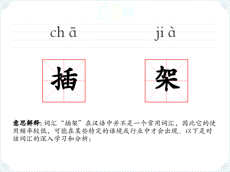 词汇“插架”在汉语中并不是一个常用词汇,因此它的使用频率较低,可能在某些特定的语境或行业中才会出现。以下是对该词汇的深入学习和分析: