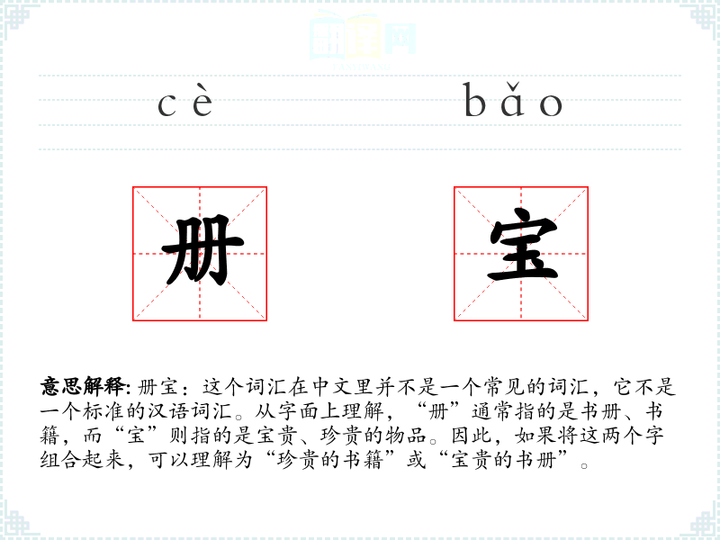 册宝:这个词汇在中文里并不是一个常见的词汇,它不是一个标准的汉语词汇。从字面上理解,“册”通常指的是书册、书籍,而“宝”则指的是宝贵、珍贵的物品。因此,如果将这两个字组合起来,可以理解为“珍贵的书籍”或“宝贵的书册”。