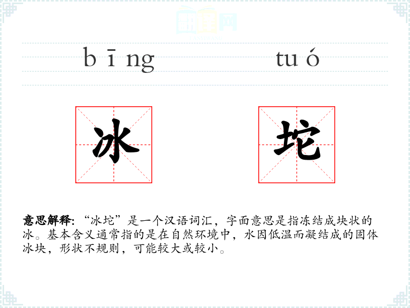 “冰坨”是一个汉语词汇,字面意思是指冻结成块状的冰。基本含义通常指的是在自然环境中,水因低温而凝结成的固体冰块,形状不规则,可能较大或较小。