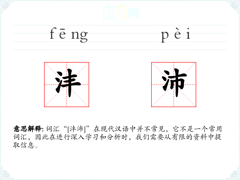 词汇“[沣沛]”在现代汉语中并不常见,它不是一个常用词汇,因此在进行深入学*和分析时,我们需要从有限的资料中提取信息。