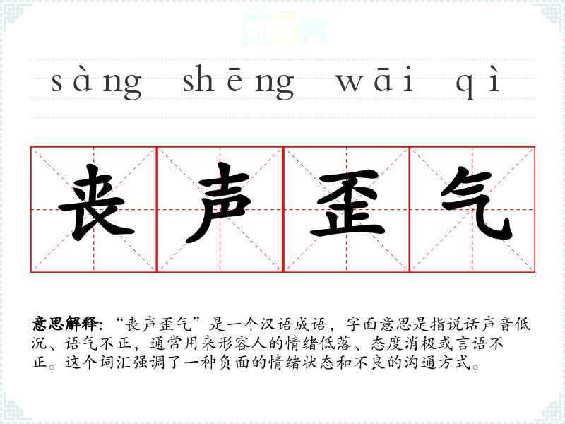 “丧声歪气”是一个汉语成语,字面意思是指说话声音低沉、语气不正,通常用来形容人的情绪低落、态度消极或言语不正。这个词汇强调了一种负面的情绪状态和不良的沟通方式。