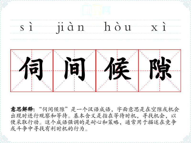 “伺间候隙”是一个汉语成语,字面意思是在空隙或机会出现时进行观察和等待。基本含义是指在等待时机,寻找机会,以便采取行动。这个成语强调的是耐心和策略,通常用于描述在竞争或斗争中寻找有利时机的行为。