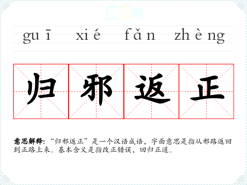 “归邪返正”是一个汉语成语,字面意思是指从邪路返回到正路上来。基本含义是指改正错误,回归正道。