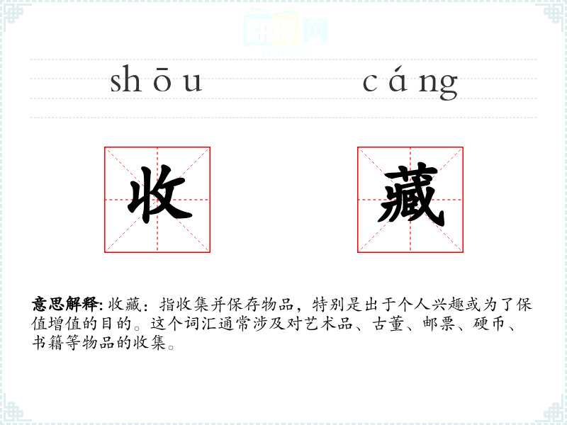 收藏:指收集并保存物品,特别是出于个人兴趣或为了保值增值的目的。这个词汇通常涉及对艺术品、古董、邮票、硬币、书籍等物品的收集。