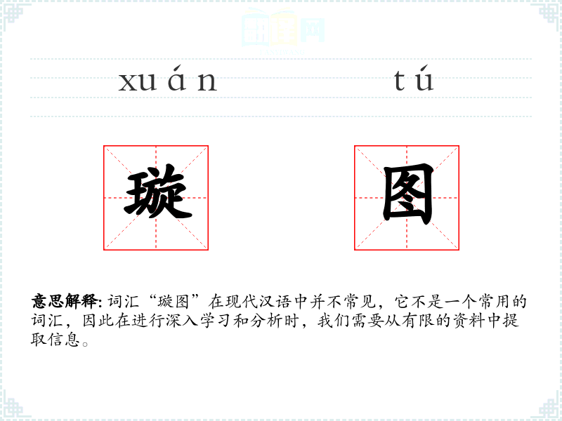 词汇“璇图”在现代汉语中并不常见,它不是一个常用的词汇,因此在进行深入学*和分析时,我们需要从有限的资料中提取信息。