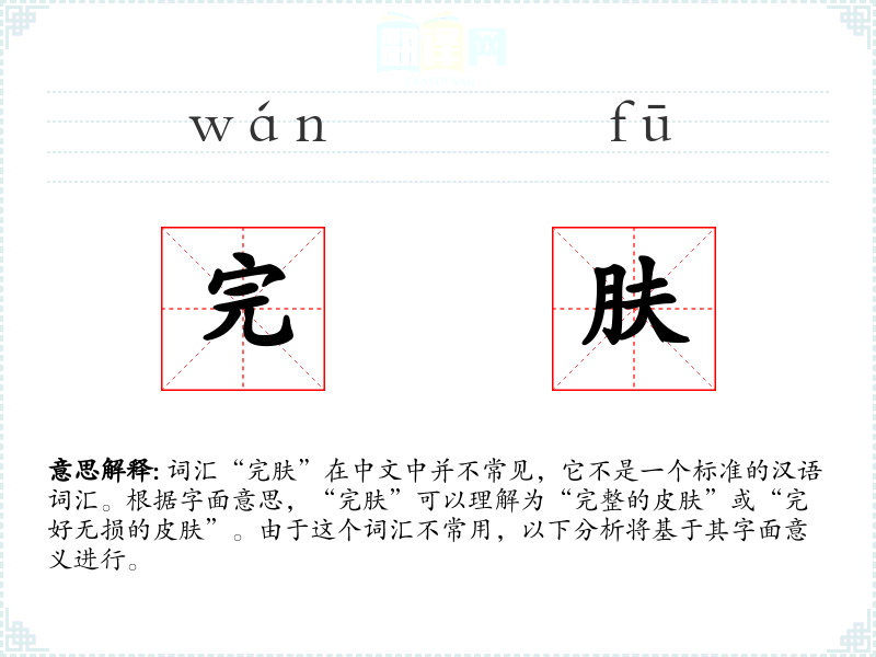 词汇“完肤”在中文中并不常见,它不是一个标准的汉语词汇。根据字面意思,“完肤”可以理解为“完整的皮肤”或“完好无损的皮肤”。由于这个词汇不常用,以下分析将基于其字面意义进行。