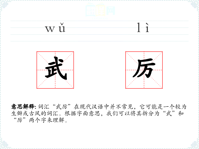 词汇“武厉”在现代汉语中并不常见,它可能是一个较为生僻或古风的词汇。根据字面意思,我们可以将其拆分为“武”和“厉”两个字来理解。