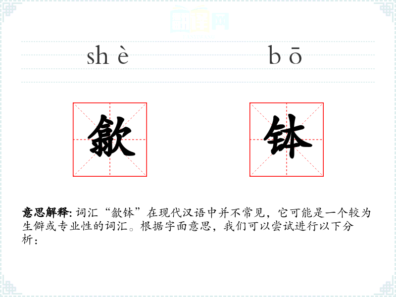 词汇“歙钵”在现代汉语中并不常见,它可能是一个较为生僻或专业性的词汇。根据字面意思,我们可以尝试进行以下分析: