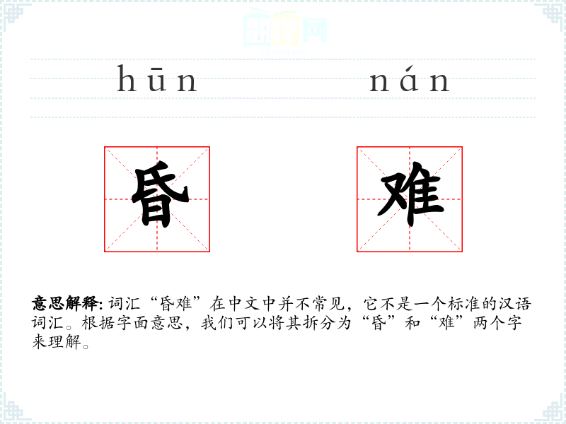词汇“昏难”在中文中并不常见,它不是一个标准的汉语词汇。根据字面意思,我们可以将其拆分为“昏”和“难”两个字来理解。