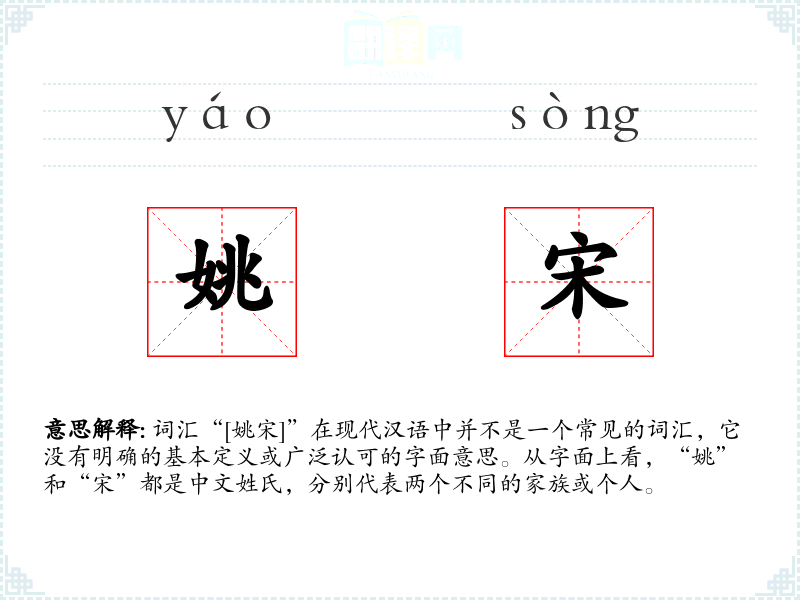 词汇“[姚宋]”在现代汉语中并不是一个常见的词汇,它没有明确的基本定义或广泛认可的字面意思。从字面上看,“姚”和“宋”都是中文姓氏,分别代表两个不同的家族或个人。
