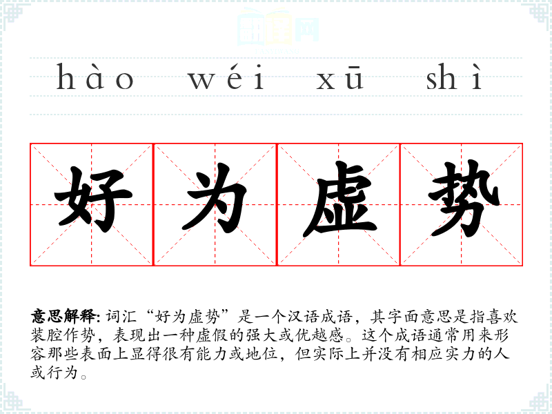 词汇“好为虚势”是一个汉语成语,其字面意思是指喜欢装腔作势,表现出一种虚假的强大或优越感。这个成语通常用来形容那些表面上显得很有能力或地位,但实际上并没有相应实力的人或行为。