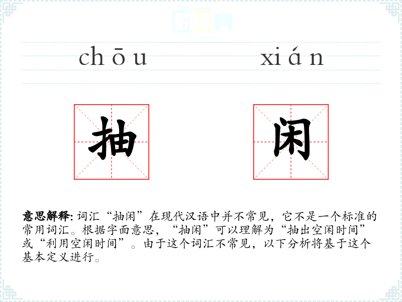 词汇“抽闲”在现代汉语中并不常见,它不是一个标准的常用词汇。根据字面意思,“抽闲”可以理解为“抽出空闲时间”或“利用空闲时间”。由于这个词汇不常见,以下分析将基于这个基本定义进行。