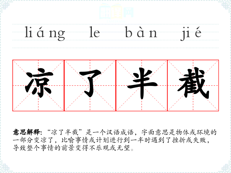 “凉了半截”是一个汉语成语,字面意思是物体或环境的一部分变凉了,比喻事情或计划进行到一半时遇到了挫折或失败,导致整个事情的前景变得不乐观或无望。
