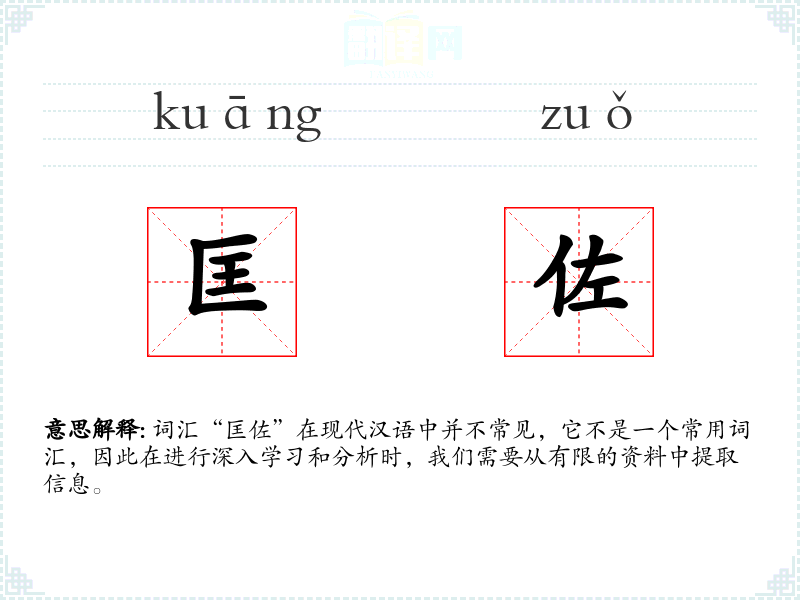 词汇“匡佐”在现代汉语中并不常见,它不是一个常用词汇,因此在进行深入学*和分析时,我们需要从有限的资料中提取信息。