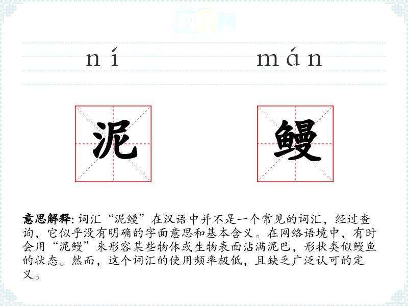 总的来说,“泥鳗”不是一个常用或标准的词汇,它的使用非常有限,且缺乏明确的定义和广泛的文化意义。在学习语言和表达时,这个词的重要性非常低,可能只在特定的语境或创作中偶尔使用。