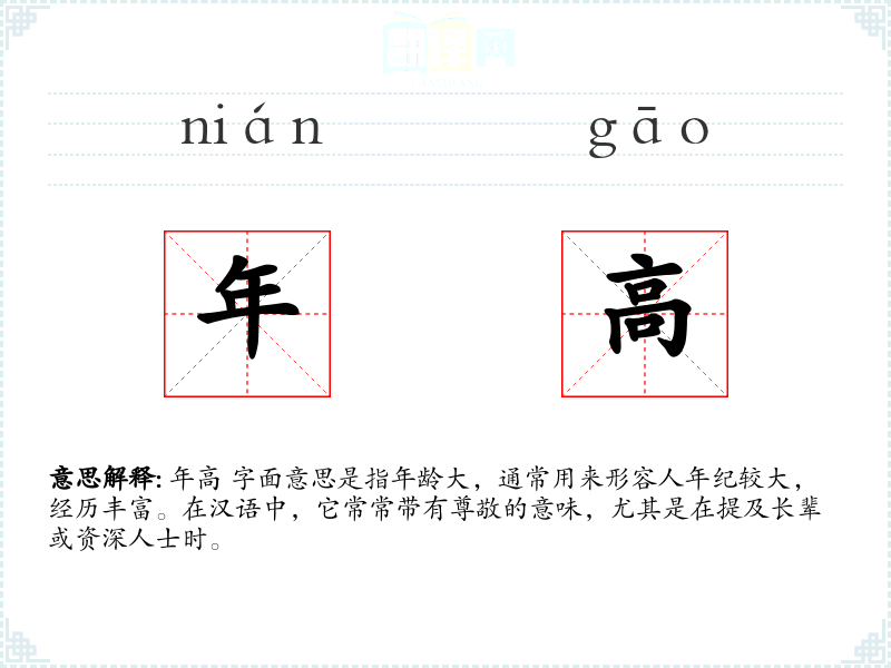 年高 字面意思是指年龄大,通常用来形容人年纪较大,经历丰富。在汉语中,它常常带有尊敬的意味,尤其是在提及长辈或资深人士时。