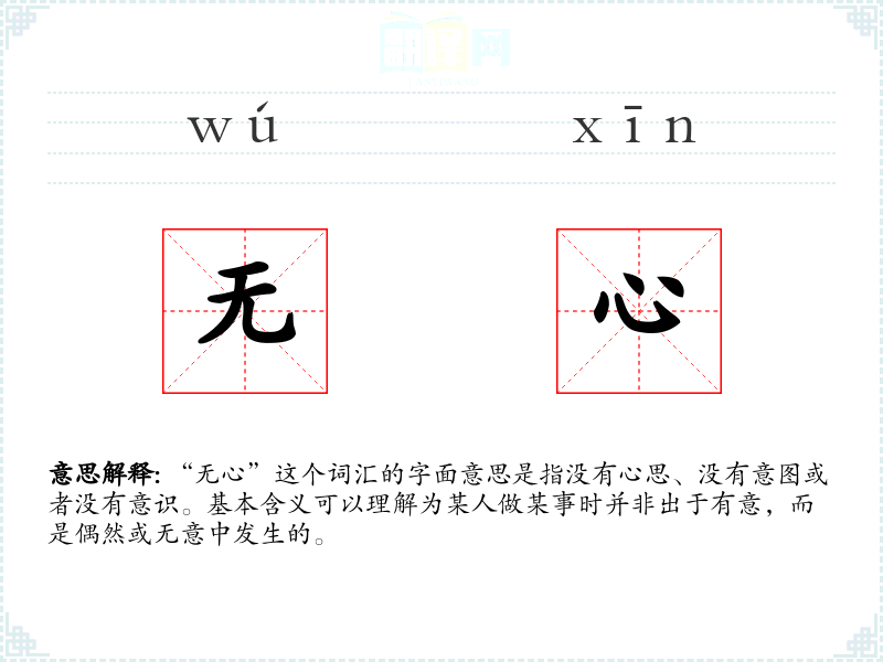 “无心”这个词汇的字面意思是指没有心思、没有意图或者没有意识。基本含义可以理解为某人做某事时并非出于有意,而是偶然或无意中发生的。