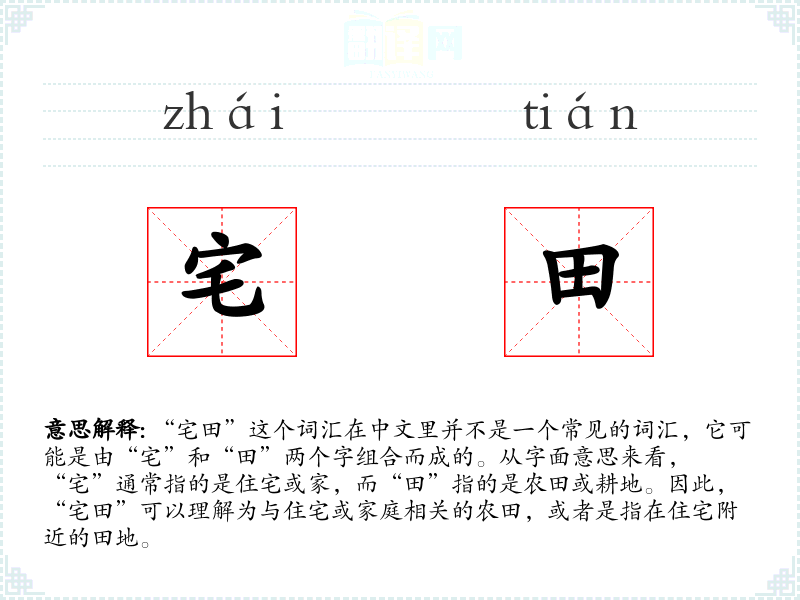 “宅田”这个词汇在中文里并不是一个常见的词汇,它可能是由“宅”和“田”两个字组合而成的。从字面意思来看,“宅”通常指的是住宅或家,而“田”指的是农田或耕地。因此,“宅田”可以理解为与住宅或家庭相关的农田,或者是指在住宅附近的田地。