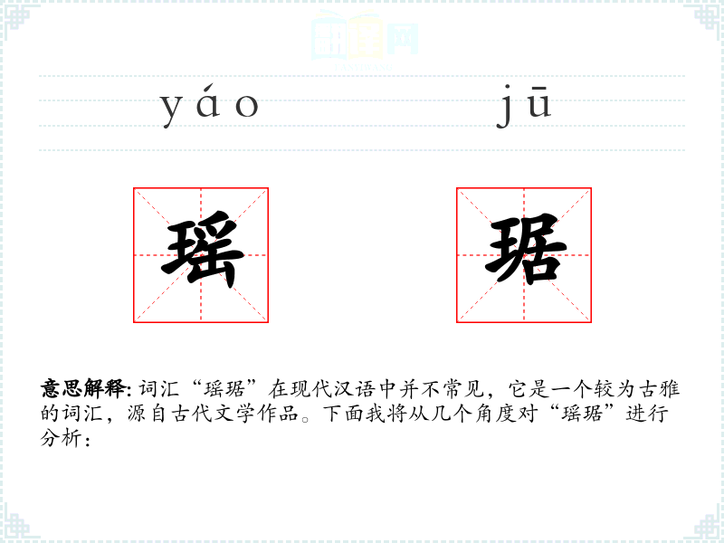 词汇“瑶琚”在现代汉语中并不常见,它是一个较为古雅的词汇,源自古代文学作品。下面我将从几个角度对“瑶琚”进行分析: