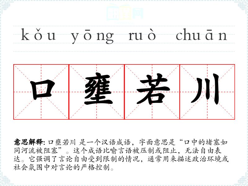 口壅若川 是一个汉语成语,字面意思是“口中的堵塞如同河流被阻塞”。这个成语比喻言语被压制或阻止,无法自由表达。它强调了****受到限制的情况,通常用来描述政治环境或社会氛围中对言论的严格控制。