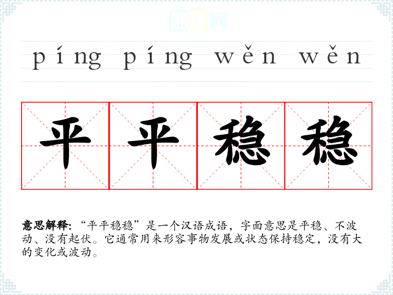 “平平稳稳”是一个汉语成语,字面意思是平稳、不波动、没有起伏。它通常用来形容事物发展或状态保持稳定,没有大的变化或波动。