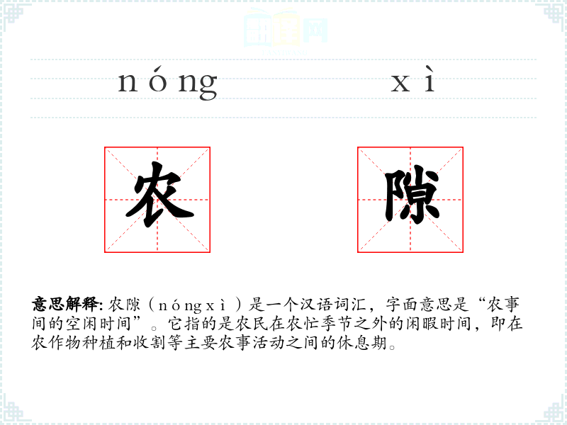 农隙(nóng xì)是一个汉语词汇,字面意思是“农事间的空闲时间”。它指的是农民在农忙季节之外的闲暇时间,即在农作物种植和收割等主要农事活动之间的休息期。