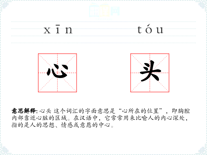 心头 这个词汇的字面意思是“心所在的位置”,即胸腔内部靠近心脏的区域。在汉语中,它常常用来比喻人的内心深处,指的是人的思想、情感或意愿的中心。
