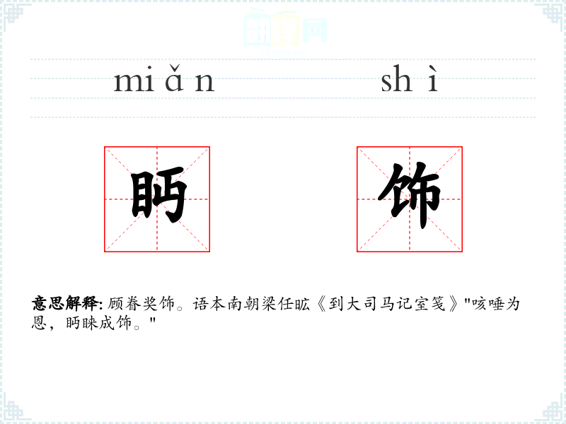 顾眷奖饰。语本南朝梁任昿《到大司马记室笺》"咳唾为恩,眄睐成饰。"