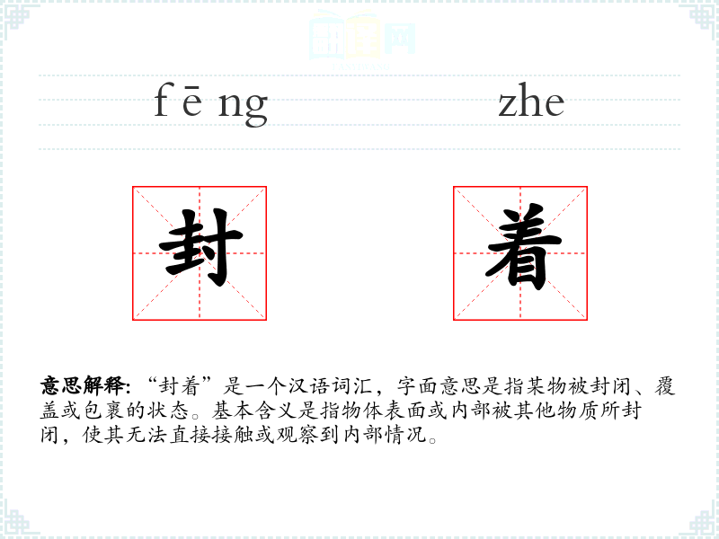 “封着”是一个汉语词汇,字面意思是指某物被封闭、覆盖或包裹的状态。基本含义是指物体表面或内部被其他物质所封闭,使其无法直接接触或观察到内部情况。